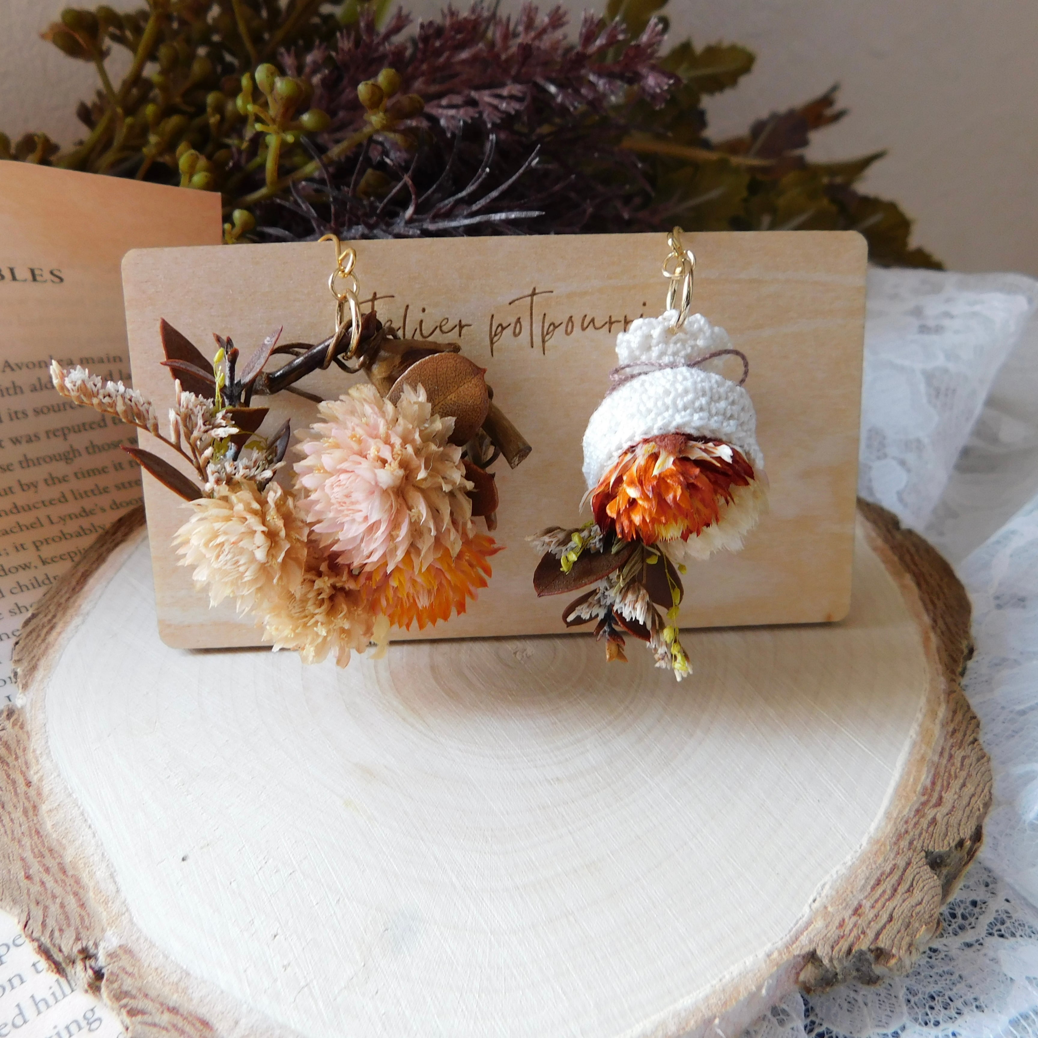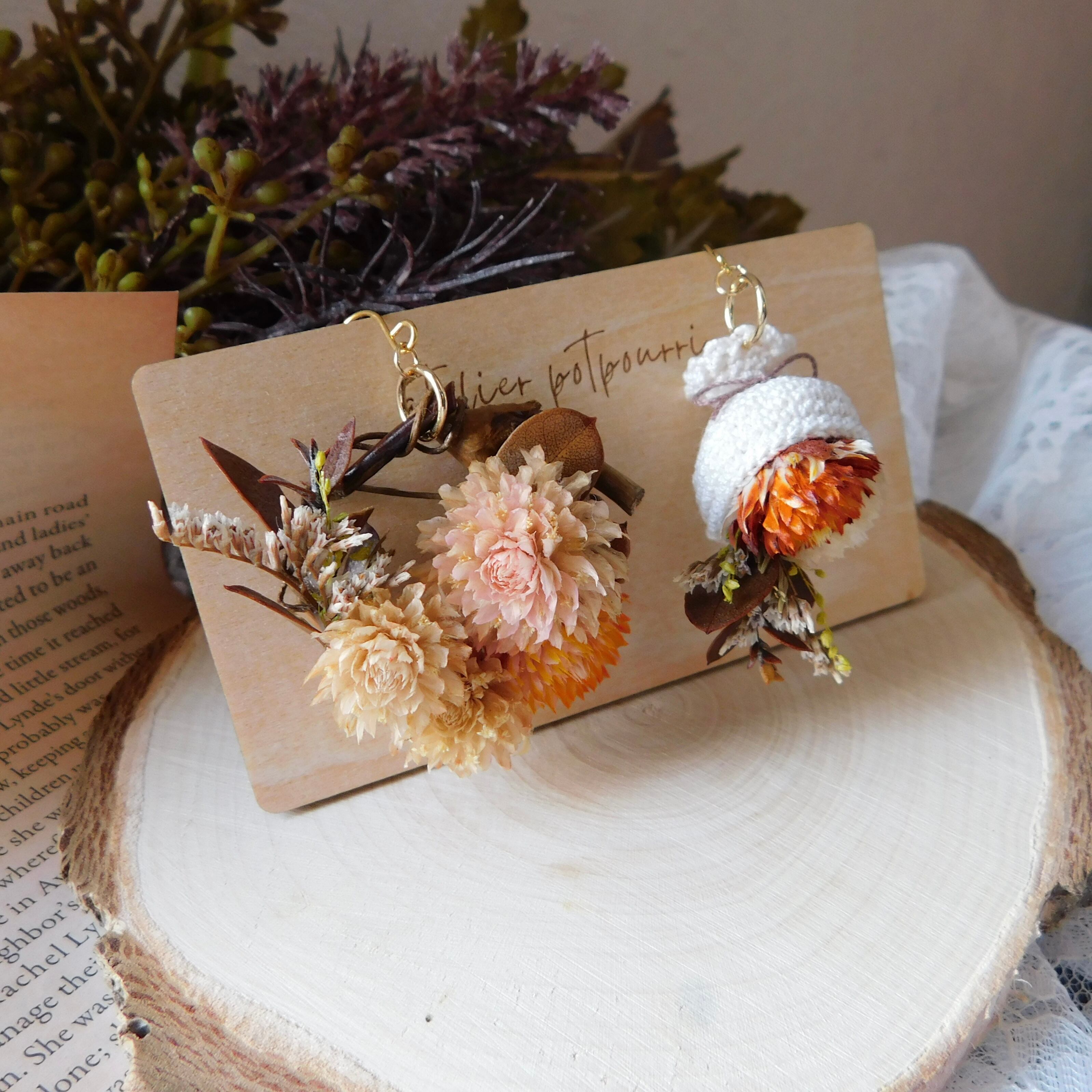 將乾燥花花圈與小花束縮小後設計成耳環♬
